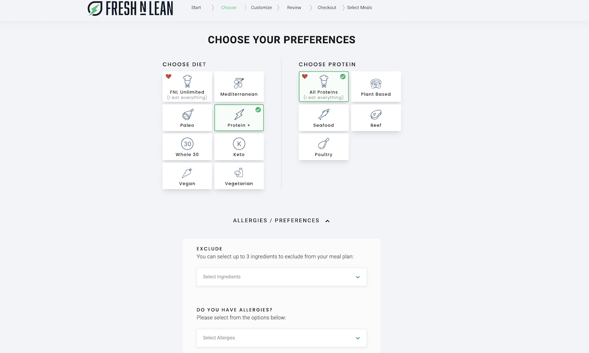 You can choose from: Fresh N Lean Unlimited, Mediterranean, Paleo, Protein +, Whole 30, Keto, Vegan, and Vegetarian meal plans. You can also select your protein preferences from all proteins, including plant-based, seafood, beef, and poultry protein options. We love that you can also list any allergies and exclude ingredients (up to three) from your meal plan.