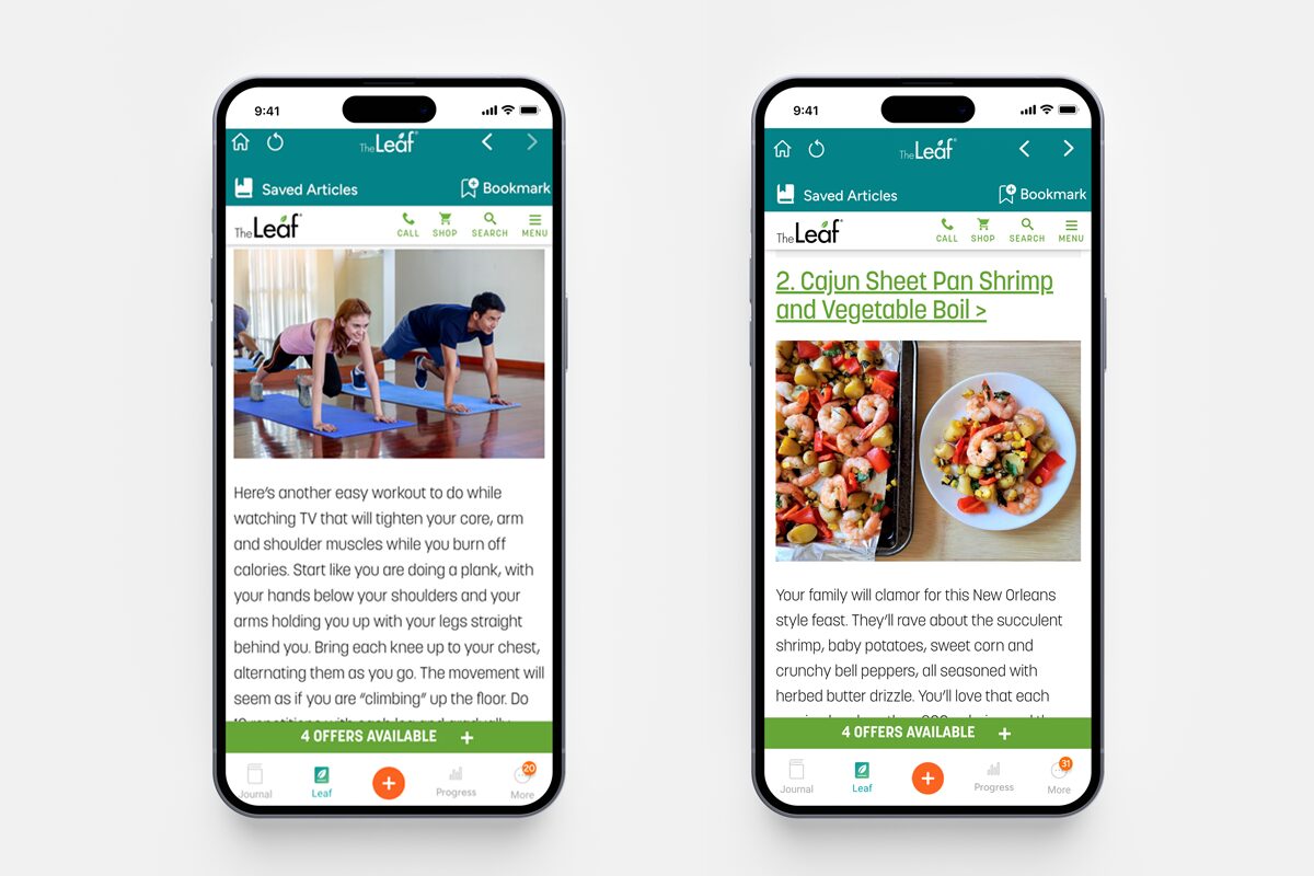 Numi links to an informational section called The Leaf, which is viewable both on the app and online. The Leaf includes articles authored by registered dietitians and healthy recipes you can cook at home.